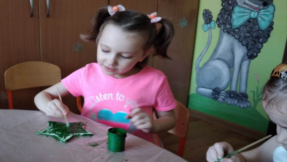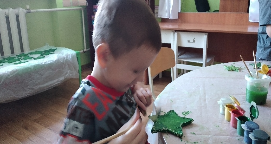 Раскатываем тесто и с помощью скалки, накладываем шаблон и стекой вырезаем звезды разного размера. Изготавливаем гирлянду, скатываем небольшие шарики и нанизываем их на нитку. Звезды и гирлянда должны высохнуть в течении суток. На следующий день приступаем к раскрашиванию гуашью.