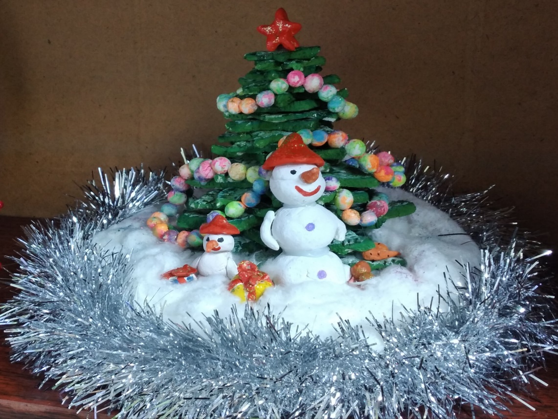 Приступаем к сборке Новогодней елочки. Звезды склеиваем горячим клеем, располагая в шахматном порядке. Мы еще дополнили нашу композицию Снеговиками с подарками.