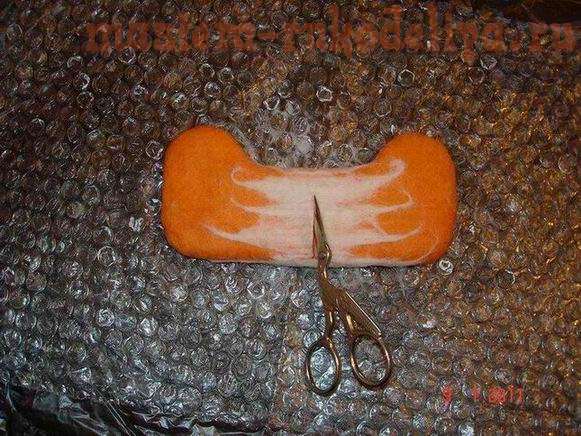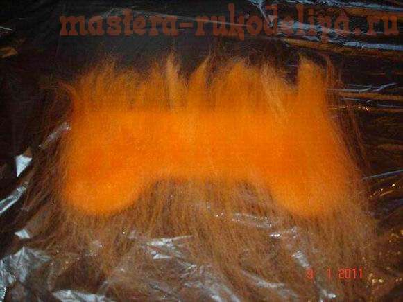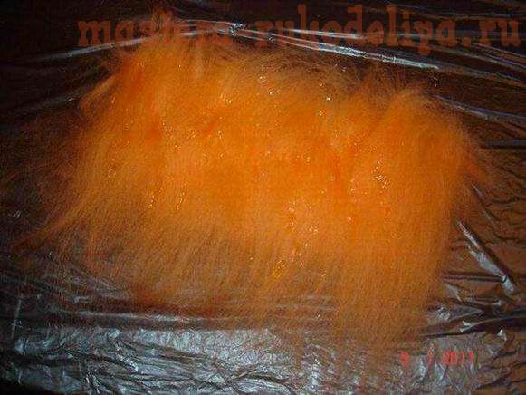 Смачиваем шерсть из распылителя. Приминаем и переворачиваем изделие. Торчащие концы приглаживаем.