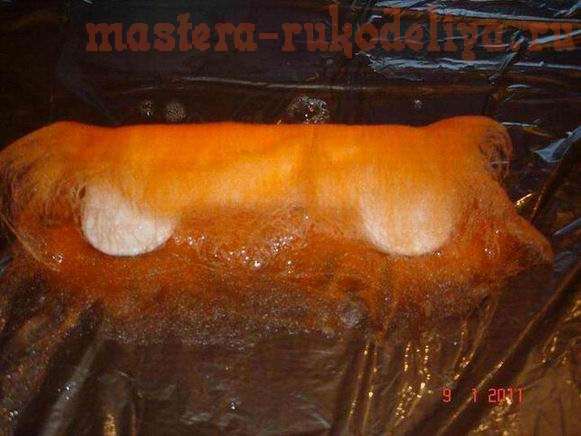 Накрываем заготовку москитной сеткой и начинаем легкими движениями тереть шерсть через сетку о пупырчатую пленку. Периодически приподнимаем сетку, чтобы шерсть не привалялась к ней. По мере того, как шерсть сваливается, становясь как бы единым целым полотном, и отдельные шерстинки уже не отделяются от него, мы начинаем тереть сильнее. Если необходимо, то смачиваем водой и добавляем мыла в процессе.