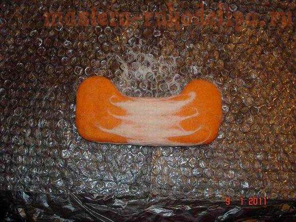 Трем каждую сторону шаблона с шерстью об пупырчатую пленку поглаживающими движениями с нарастающей интенсивностью 5-10 мин. Там где не получается пройтись пленкой, трем пальцами: вначале нежно, а когда шерсть свалялась посильнее. Вы почувствуете какой нужно делать нажим сами - если передавить - то шерсть как бы двигается под пальцами.