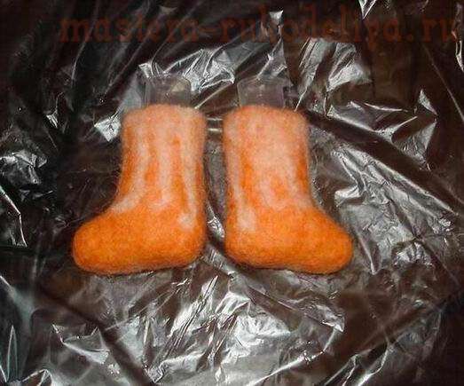 На этом этапе засовываем указательные пальцы обоих рук внутрь валенок, смачиваем мыльным раствором заготовку и продолжаем тереть валенки об пленку. Придаем изделию желаемую форму. Разравниваем все сгибы, расправляем заломы, если они образовались. Трем достаточно интенсивно. Периодически проверяем, чтобы валенки были одинаковыми. Валяйте до того момента пока валенки не уменьшатся на четверть по сравнению с шаблоном.