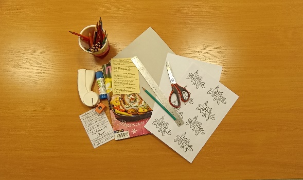 Нам понадобятся следующие материалы и инструменты: Лист белого картона, тематические вырезки из журнала, клей, ножницы, стихи, шаблон ветки ели со свечой, цветные карандаши, линейка, надпись: «С Новым годом!», фигурный дырокол «снежинка» или готовые элементы декора – снежинки, звездочки.