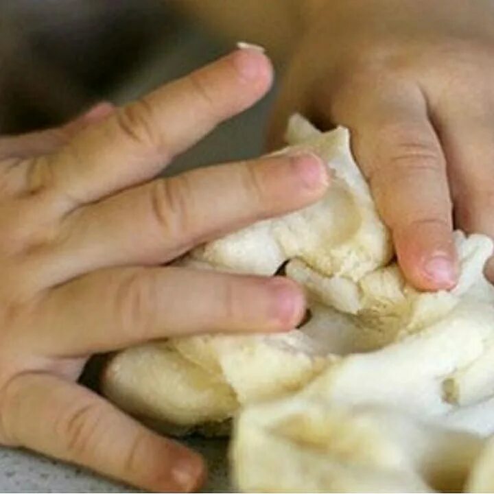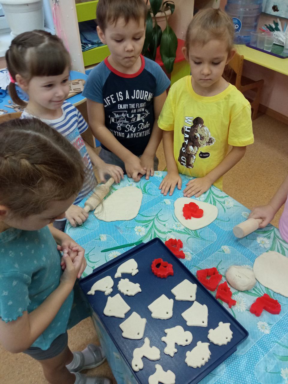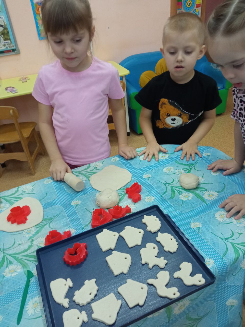 Воспитатель: А теперь занимайте места за столиками. Посмотрите на свои столы, на каждом есть разделочная доска, скалка для раскатывания теста и готовое солёное тесто . ( его нельзя есть ,из него делают поделки).
