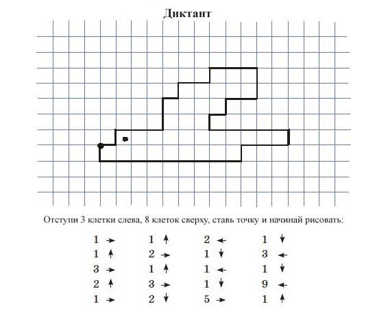 (У каждого ребёнка образец птицы, нарисованной по клеточкам, листок бумаги в клетку с начальной точкой, карандаш)