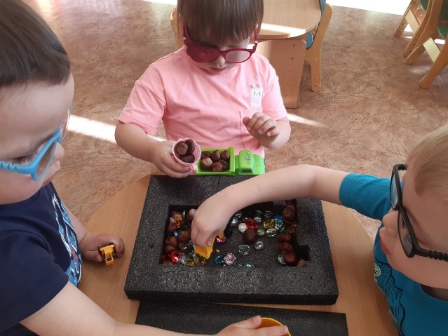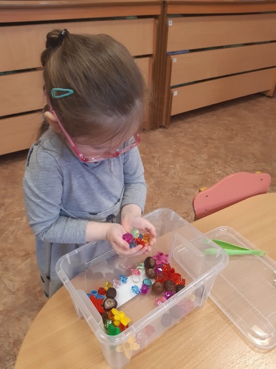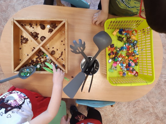 · сортировка мелких предметов (камушки, пуговицы, желуди, бусинки, фишки, ракушки), разных по величине, форме, материалу;