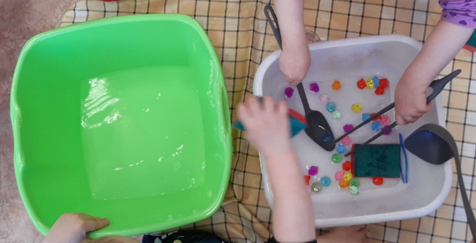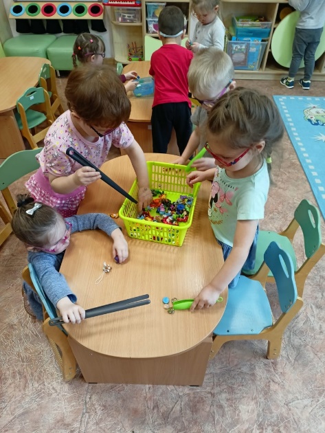 -Вылавливание игрушек из ёмкости различными способами (руками, пинцетом, поварёшкой).