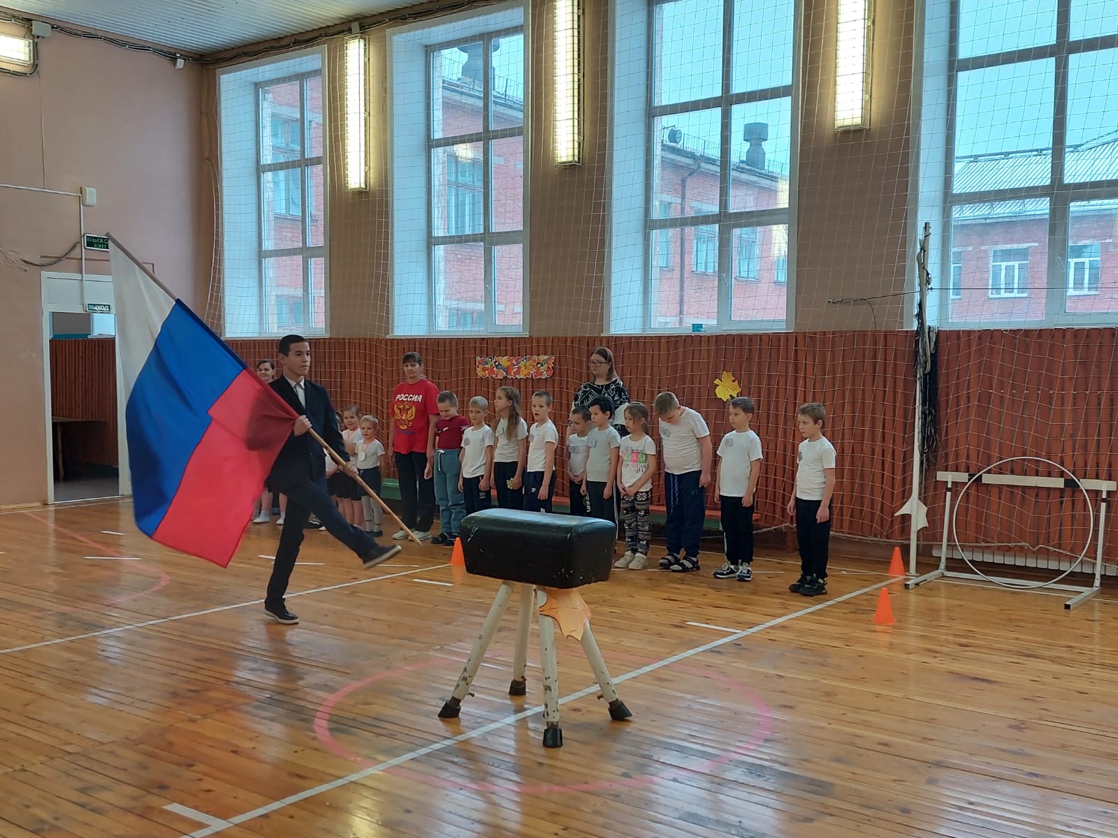 Звучит Гимн Росссии. Предоставляется право внести флаг России ученику нашей школы Екимову Андрею.
