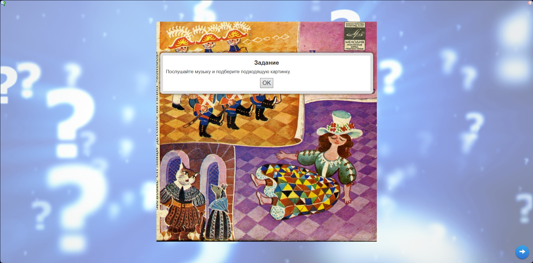Викторина «Угадай музыку!» (https://learningapps.org/watch?v=pagxp6rdt24) состоит из 5 вопросов. Малое количество заданий обусловлено неспособностью детей долго концентрировать внимание, ограничениями времени занятия и репертуаром со слушания музыки.