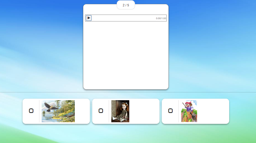 Система аналогична предыдущему тесту: ребенок прослушивает запись целиком или частично (по сложившейся ситуации и усмотрению музыкального руководителя), выбирает картинку с ответом. Картинки при необходимости могут быть увеличены для более детального рассмотрения путем нажатия. Материалом стала музыка из «Детского альбома» П.И. Чайковского как наиболее образная, характерная и понятная детям.