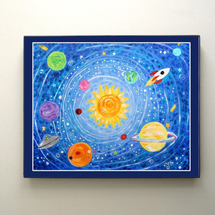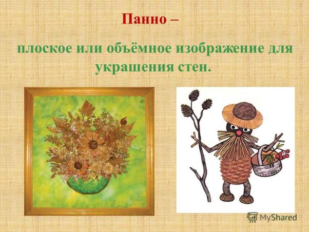 | - Итак, ребята, сегодня мы с вами сегодня изготовим панно на космическую тему. Что такое панно? (Картина). -Панно – это предмет декоративного назначения, картина, выполненная на куске ткани, дерева или из другого материала. Панно может выглядеть, как часть стены. Его отличительная черта – рисунок нанесен не на стену, а на отдельную конструкцию. Учитель показывает образцы панно: