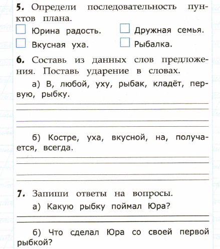 Рефлексия -Допиши слово -Определи последовательность. | «Допиши слово» (Сварила бабушка …….(уху); Отправилась большая дружная семья на …..(рыбалку) ; Поймал Юра крохотного …..(ерша) - С каким рассказом мы сегодня познакомились? - Кто написал этот рассказ? - Как можно охарактеризовать Юру?
