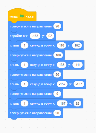 - Используйте блоки «Движение»: «переместись на», «повернуться на».