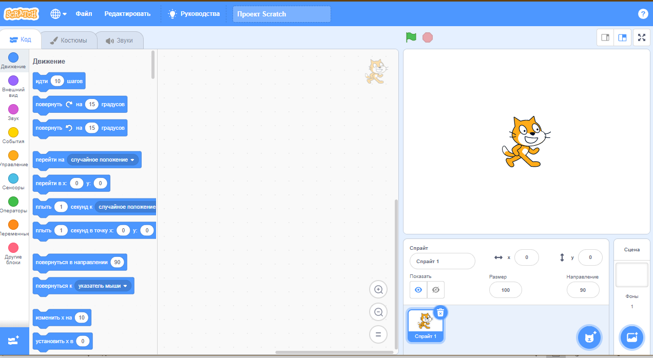 Простое знакомство с интерфейсом программы. Дети видят и трогают мышкой, узнают, что значит кнопка запуска, остановка, перемещение спрайтов (персонажей) и управление цветами.
