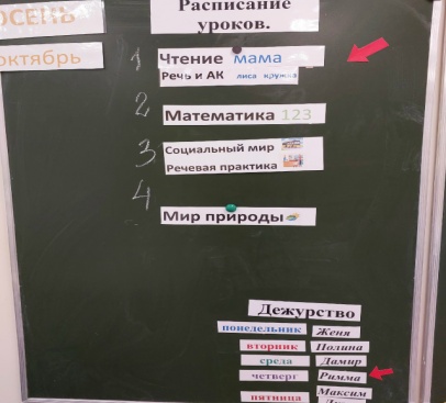 В настрое на урок задействованы три этапа: организационный момент, игра «Четвертый лишний», рефлексия. Настрой на урок – дисциплинирует обучающихся, помогает переключиться на учебную деятельность. Была проведена игра «Четвертый лишний», поставлена проблемная ситуация. Каждый этап урока подобраны в соответствии с возможностями (умственными, физическими) детей моего класса, они доступны для понимания и выполнения заданий и упражнений. Так как в классе обучающиеся разных вариантов, то задания подбирались таким образом, чтобы все ученики были задействованы, и в то же время каждому ребенку было уделено внимание.