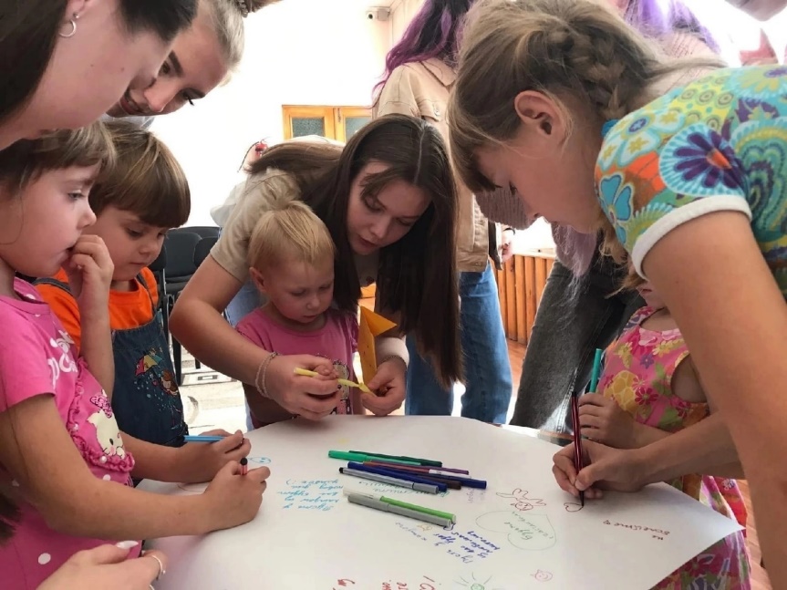Игровые мероприятия, оригами, плетение браслетов, закладок, подвижные игры, игры на логику – все это сопровождается громким смехом и улыбками детей и студентов. Мы рисуем отпечатки рук на ватмане, пишем друг другу пожелания, дарим подарки, тепло и фотографируемся.