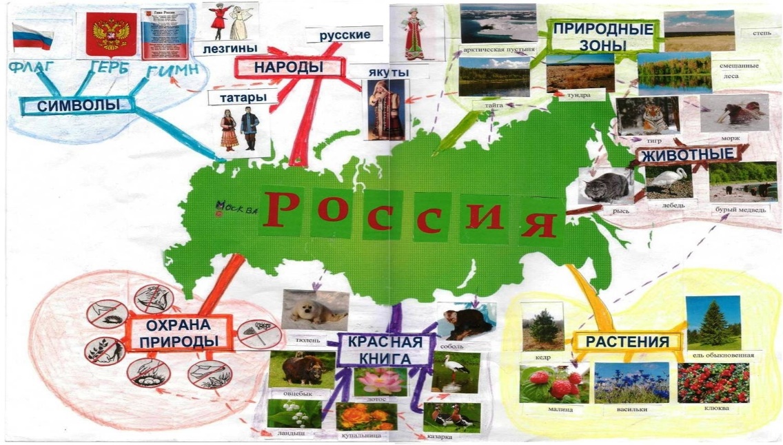 Тема «Россия на карте» - знак Города, Река, Равнина, Озеро, Горы