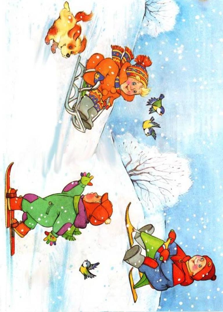 Беседа«Зима, веселится детвора»с использованием иллюстраций зимнего досуга детей на улице, обращаем внимание на то, что делают дети на улице, катаются на санках, коньках, лыжах, в снежки, лепят снеговиков. Снеговика лепит один мальчик, а в снежки играют много детей.