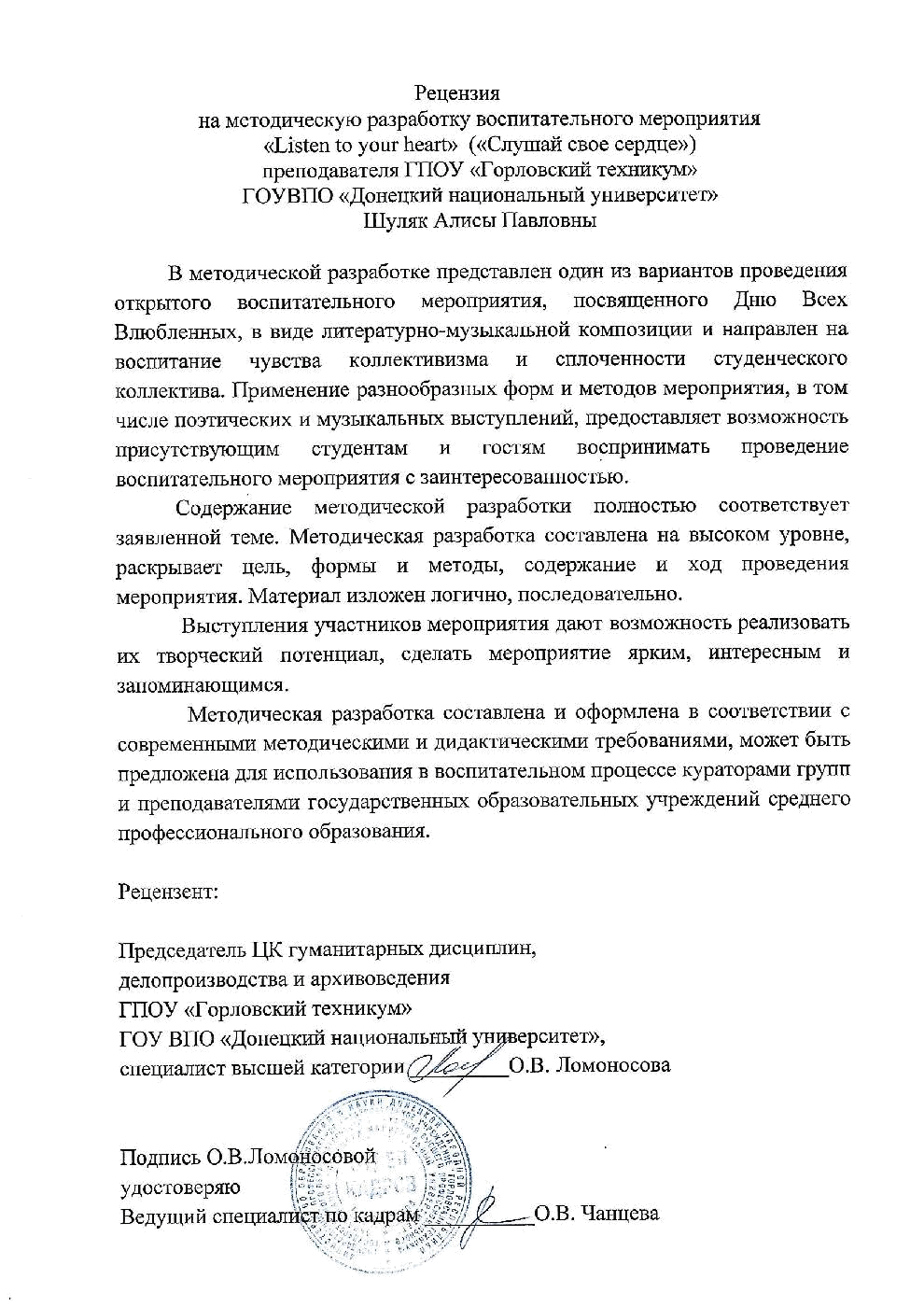 Ломоносова О.В. председатель цикловой комиссии гуманитарных дисциплин, делопроизводства и архивоведения ГПОУ «Горловский техникум» ГОУВПО «Донецкий национальный университет», преподаватель иностранного языка, специалист высшей категории.