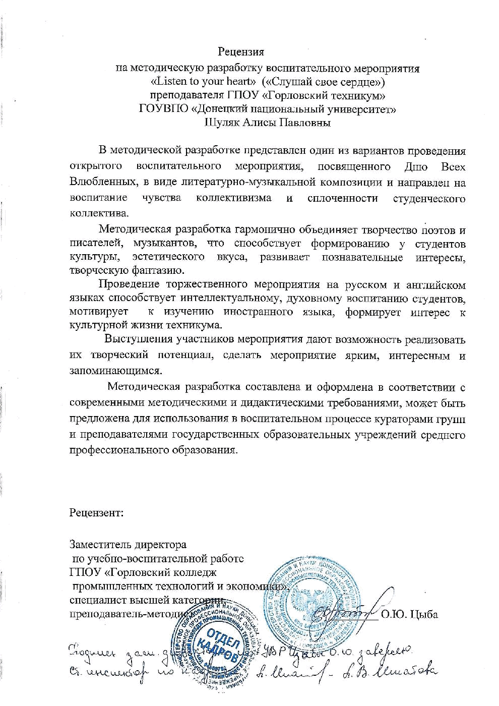 Шуляк А.П.– преподаватель иностранного языка ГПОУ «Горловский техникум» ГОУВПО «Донецкий национальный университет», специалист второй категории.