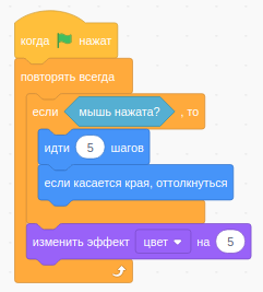 Разместим команду "изменить эффект цвет на … " после блока "если".