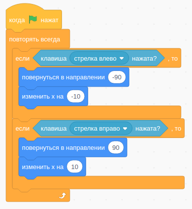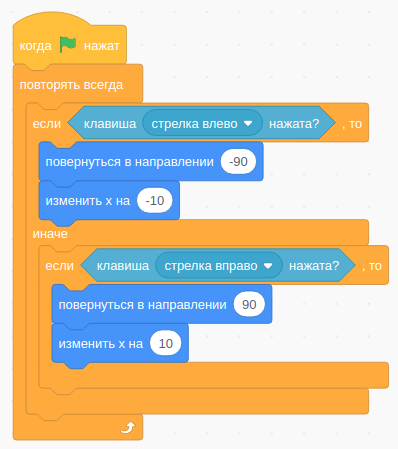 А как быть, если мы хотим, чтобы кот двигался налево, когда мы нажимаем на клавиатуре клавишу налево. И кот двигался бы направо, когда мы нажимаем клавишу направо. Можно решить задачу, используя два отдельных "если":