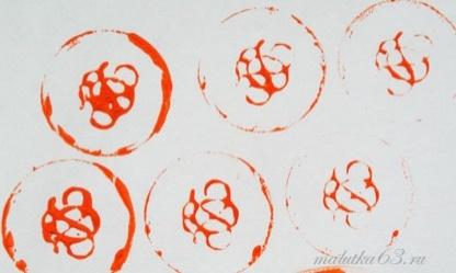 Печать-клише. | Для ее исполнения, кроме красок, понадобится заранее подготовленный деревянный брусок, который удобно будет держать в руке. На гладкий конец бруска наклеивается картон, а уже на него мастерятся и прикрепляются узоры. Материалом для их изготовления может послужить веревка или же бумага. Кроме того, можно превратить в печати различные подручные средства, например, баночки из-под маминого крема с рельефным узором на крышке, старые чайные ложечки с рельефным узором, плоские ракушки и многое другое. |