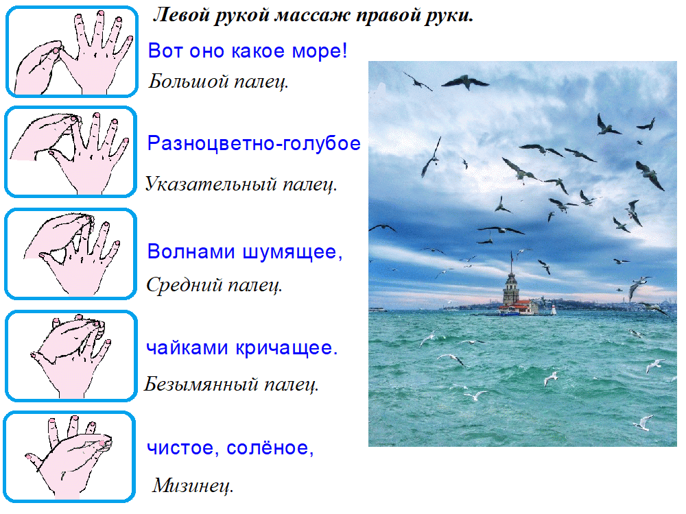 Педагог-психолог читает текст и показывает движения (на каждую строку стихотворения разминается один палец).