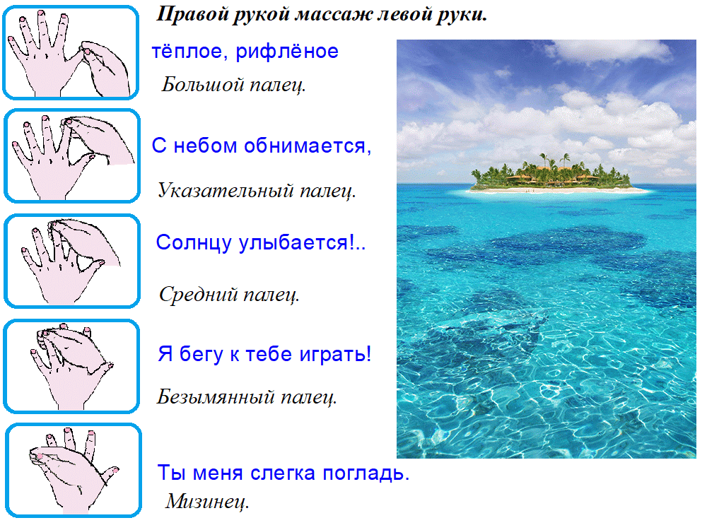 • дотронуться до песка поочередно пальцами одной, потом второй руки, затем всеми пальцами одновременно;