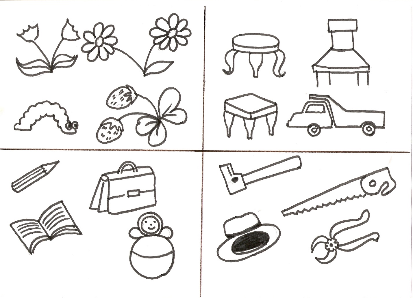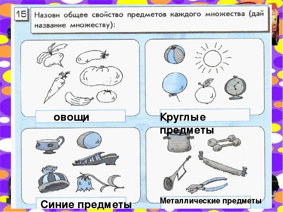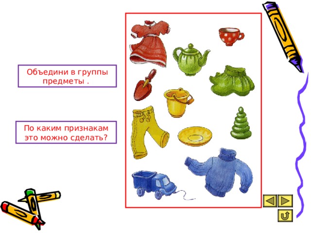1. Для объединения предметов в единое множество ребенок учится собирать вместе разложенные на столе предметы: "Положи карандаши в корзинку Покажи, где много карандашей?"