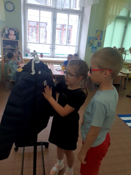 оспитатель:Правильно. Все предметы мы видим только благодаря свету, который упал на них и отразился. Чтобы защитить себя, нужно увеличить расстояние, с которого водитель сможет увидеть тебя. Секрет светоотражателей в том, что их делают из специального материала, который отражает свет и направляет его в сторону водителя. Две куртки у нас без световозвращающих элементов, как нам исправить ситуацию?