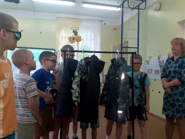 Воспитатель:Когда на улице темнеет, начинаются сумерки, идет дождь или снег, а также во время тумана, пешехода очень трудно заметить. Говорят, на улицах города появляются «темные» пешеходы. Перед вами вешалка с куртками. Выберите, те куртки, в которых на наш взгляд, будет безопасно в темное время суток.