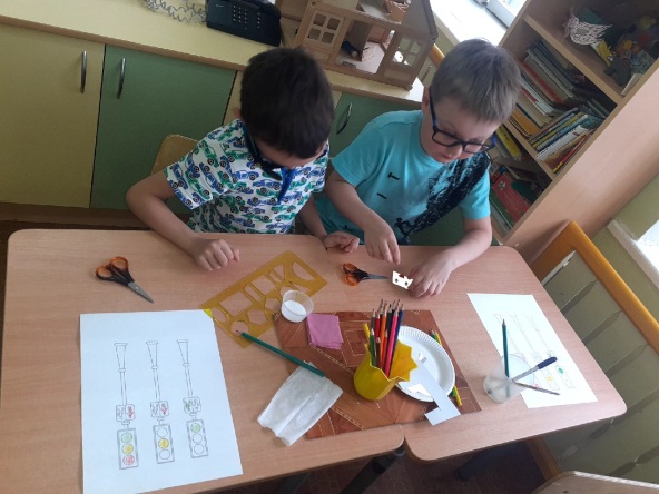 Воспитатель: Но сегодня, в нашем городе все светофоры неисправны.Передвами карточки с изображением трёх светофоров. Вот только светофоры эти не исправны. Нужно раскрасить их так, чтобы на первом горел красный цвет, на втором – жёлтый, на третьем – зелёный. Затем нужно раскрасить человечков так, чтобы цвет человечков соответствовал цвету каждого сигнала светофора.