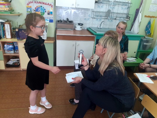 оспитатель: Ребята, о том, чем мы сегодня занимались, и какое задание вам понравилось больше всего, расскажите с помощью интервью. Начну я, затем тот ребенок, который отвечал на вопросы, сможет взять интервью у любого из вас и наших гостей тоже.