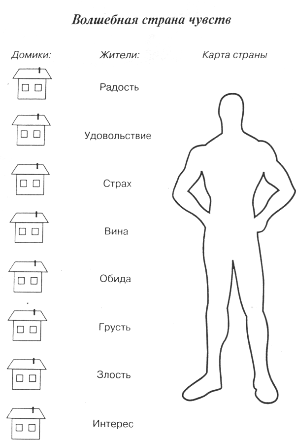 Инструкция 1:«Далеко-далеко, а может быть, и близко, есть волшебная страна, и живут в ней Чувства: Радость, Удовольствие, Страх, Вина, Обида, Грусть, Злость, Интерес. Живут они в маленьких цветных домиках. Причем каждое Чувство живет в домике определенного цвета. Кто-то живет в красном домике, кто-то в синем… Каждый день, как только встает солнце, жители волшебной страны занимаются своими делами.