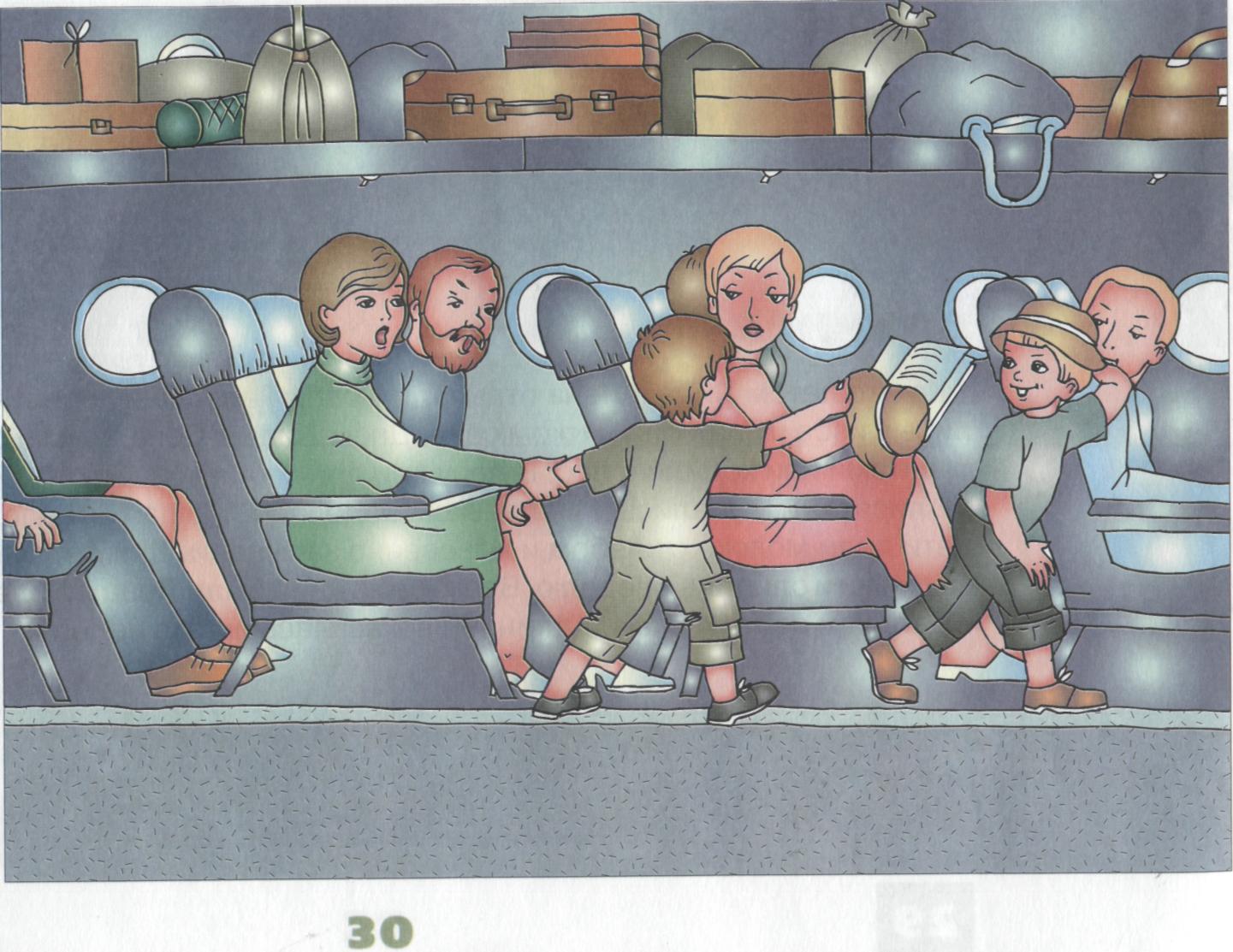 Толя и Коля вели себя неспокойно: много бегали и хохотали. Они снимали с головы свои панамки, подкидывали их и попадали в соседей по салону. Мама пыталась остановить детей, но Толя и Коля не хотели успокаиваться. Все в самолёте были недовольны поведением близнецов.