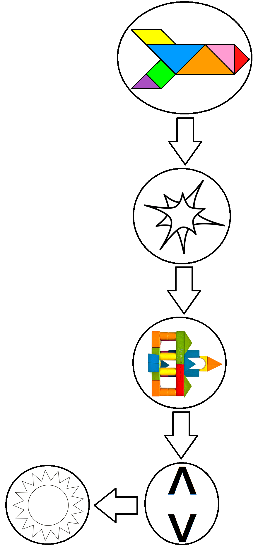 Дефектолог:Конечно, нам надо построить космический корабль. Это схема построения ракеты. (Показывает образец и крепит его на доску). Пододвигайте свои космодромы и стройте ракеты.