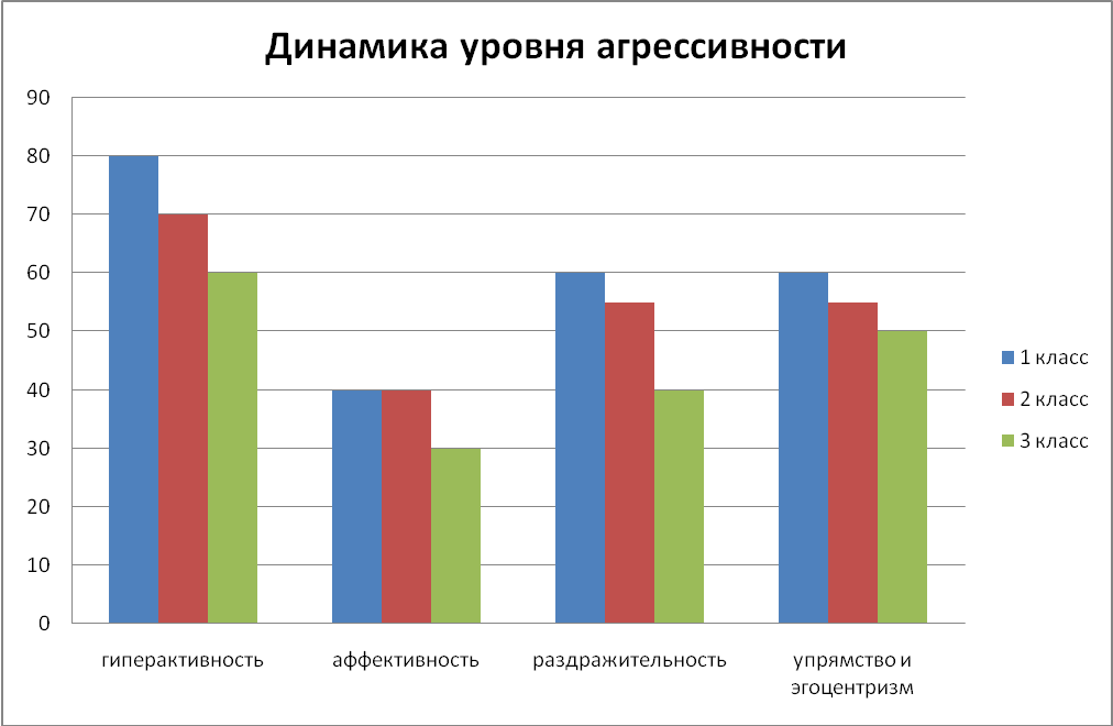 Таким образом, надо обучать не только чтению и письму, но и правильному поведению, адекватной реакции на окружающих. Только систематичность такого обучения обеспечит педагогический успех. Работая по данной методике несколько лет, можно отметить некоторые позитивные сдвиги по снижению уровня детской агрессивности: гиперактивность с 80% до 60%, аффективность с 40% до 30%, раздражительность с 60% до 40%, упрямство и эгоцентризм с 60% до 50%.