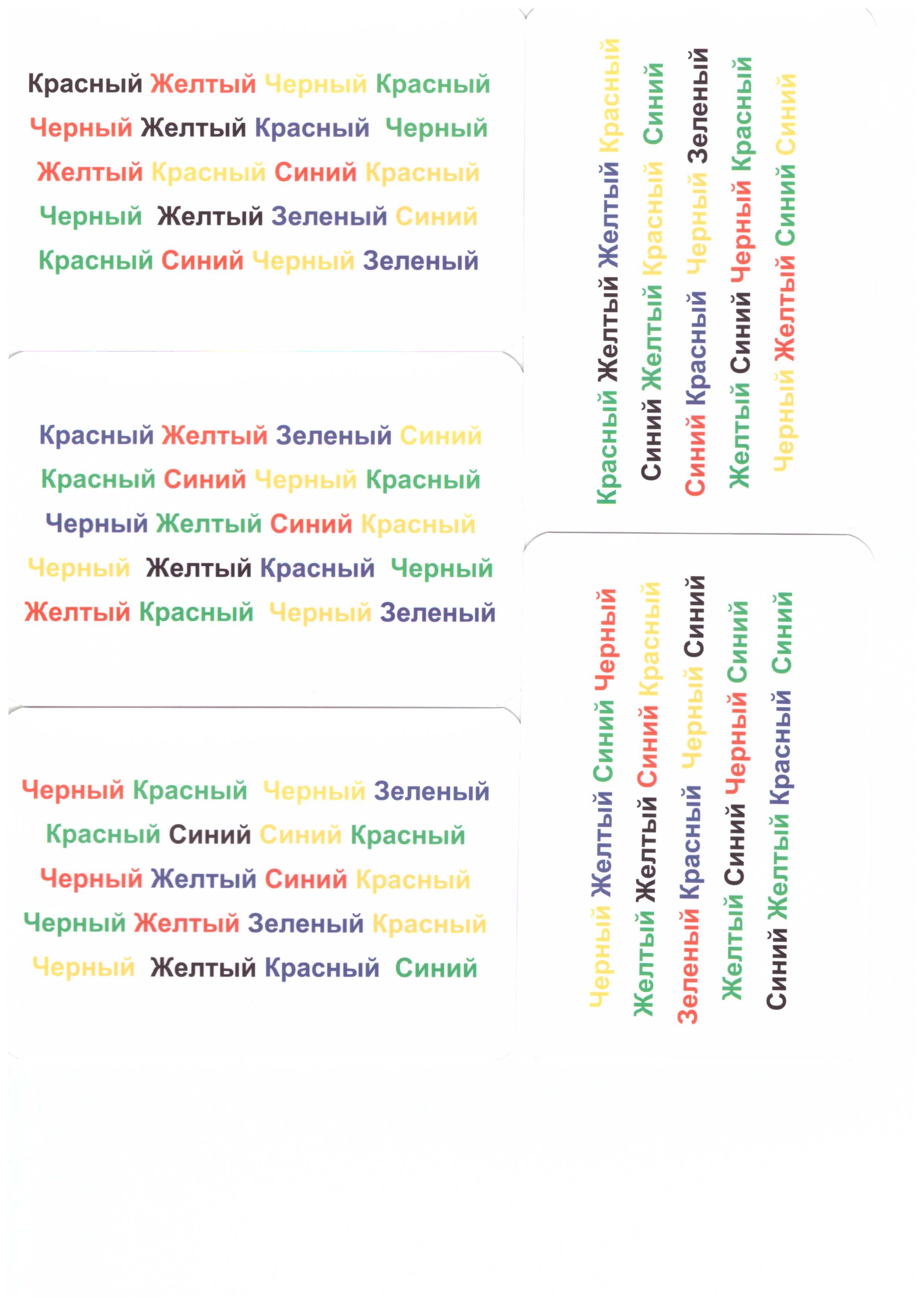 Слова на карточках написаны так, что одно слово нагромождается на другое, пересекается с ним. Количество смешанных слов и плотность их наложения может увеличиваться.