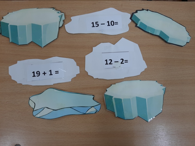 Продолжаем наш путь. Перед нами Счётное озеро. Оно покрыто льдом. Ребята, нужно быть осторожным, устно считая, правильно его пройти. Потому что во многих местах лёд ещё тонкий. У каждого из вас на партах лежат льдинки, где написаны примеры. Вы должны решить пример и прикрепить её к соответствующему числу н Счётном озере.