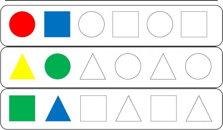 (усложнение – фигуры окрашены в 3 изученных ребенком цвета, таким образом, нужно найти 2 недостающих признака – цвет и форму).