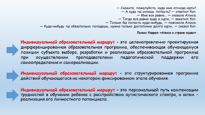 Существует большое количество определений «индивидуального образовательного маршрута», но мы сегодня рассматриваем его, как персональный путь компенсации трудностей в обучении ребенка с расстройством аутистического спектра, а затем – реализация его личностного потенциала.