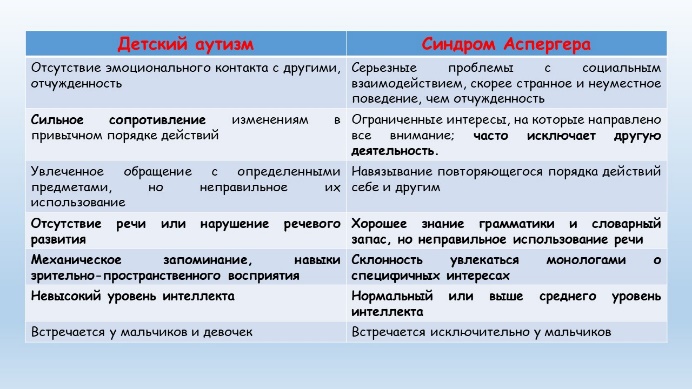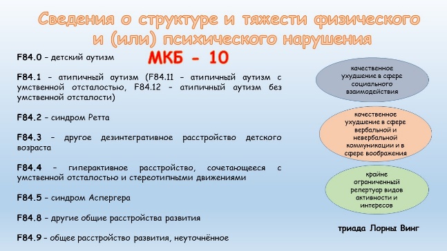 ля диагностики расстройства аутистического спектра сегодня все еще используется МКБ-10 рубрика F84 «Общие расстройства психологического развития». На сегодняшний день в нашей стране основу диагностики аутизма составляют три ключевых признака, известные как триада Лорны Винг: качественное ухудшение в сфере социального взаимодействия; качественное ухудшение в сфере вербальной и невербальной коммуникации и в сфере воображения; крайне ограниченный репертуар видов активности и интересов.