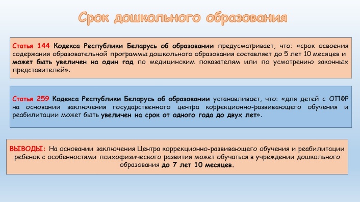 родолжительность срока получения дошкольного образования составляет период с момента приема воспитанника в учреждение дошкольного образования и до приема его в учреждение образования для получения общего среднего или специального образования. Возрастной период с двух месяцев до шести лет определяет срок освоения содержания образовательной программы дошкольного образования (до пяти лет десяти месяцев и возможностью увеличения на один год по медицинским показаниям или по усмотрению законных представителей воспитанников).