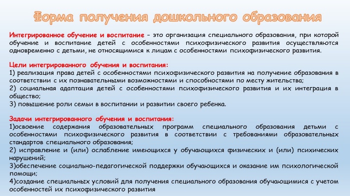 Форма получения образования определяется психолого-медико-педагогической комиссией ЦКРОиР. Как правило это обучение либо в специальной группе, либо в группе интегрированного обучения и воспитания.