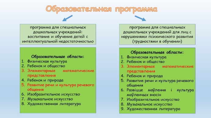 Образовательная программа специального образования определяется специалистами психолого-медико-педагогической комиссии ЦКРОиР. Образовательная программа не может определяться лишь диагнозом – необходимо учитывать те дефициты и нарушения, которые выявлены у конкретного ребенка. В нашем случае, в группе интегрированного обучения и воспитания реализуется 3 образовательных программы: учебная программа дошкольного образования (14 воспитанников), программа для специальных дошкольных учреждений: воспитание и обучение детей с интеллектуальной недостаточностью (1 воспитанник) и программа для специальных дошкольных учреждений для лиц с нарушениями психического развития (трудностями в обучении) – (2 воспитанника).