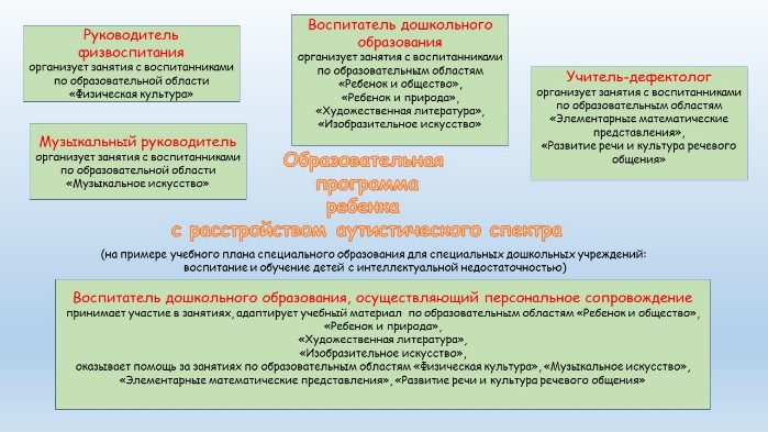 Вреализации образовательной программы по соответствующим образовательным областям принимают участие следующие педагогические работники учреждения дошкольного образования: руководитель физвоспитания, музыкальный руководитель, учитель-дефектолог, воспитатель дошкольного образования и воспитатель дошкольного образования, осуществляющий персональное сопровождение ребенка с расстройством аутистического спектра.