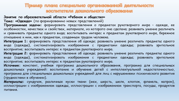 Следует обратить внимание воспитателей дошкольного образования групп интегрированного обучения и воспитания на дифференциацию программного содержания для воспитанников с расстройством аутистического спектра в рамках специально организованной деятельности по образовательным областям образовательных программ. План реализации образовательного процесса не может быть единым для всех воспитанников группы, т.к. мы реализуем разные образовательные программы в условиях группы интегрированного (совместного) обучения и воспитания.