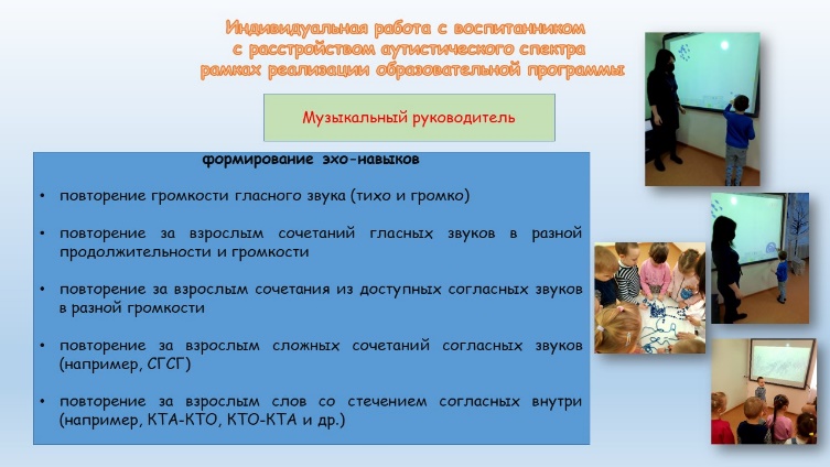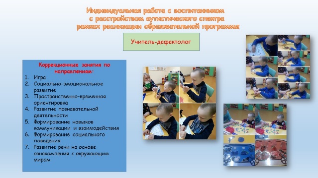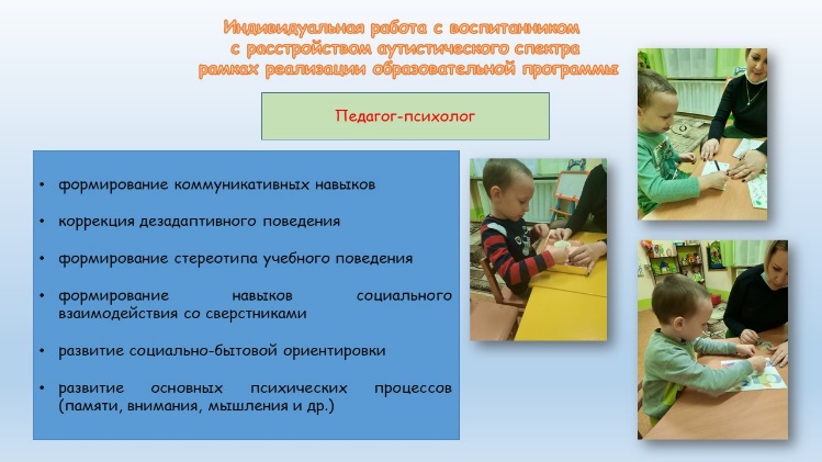 Индивидуальная работа с воспитанниками с расстройством аутистического спектра осуществляется не только учителем-дефектологом, но и иными педагогическими работниками учреждения дошкольного образования.