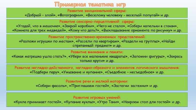 Игровая деятельность – ведущий вид деятельности детей дошкольного возраста, поэтому формирование познавательного и личностного развития может полноценно осуществляться только в рамках игровой деятельности. Цель коррекционных занятий «Обучение игре» - использование игровой деятельности как средства формирования и развития познавательной деятельности, личности и социального взаимодействия воспитанников с нарушениями психического развития. В ходе занятий мы учимся складывать целый предмет из частей, сравнивать предметы по заданному признаку, различать форму, цвет и величину предмета, группировать предметы, использовать предметы – заместители, понимать воображаемую ситуацию, соотносить действие и функциональное назначение предмета, определяем эмоциональное состояние человека в игровой ситуации и др.